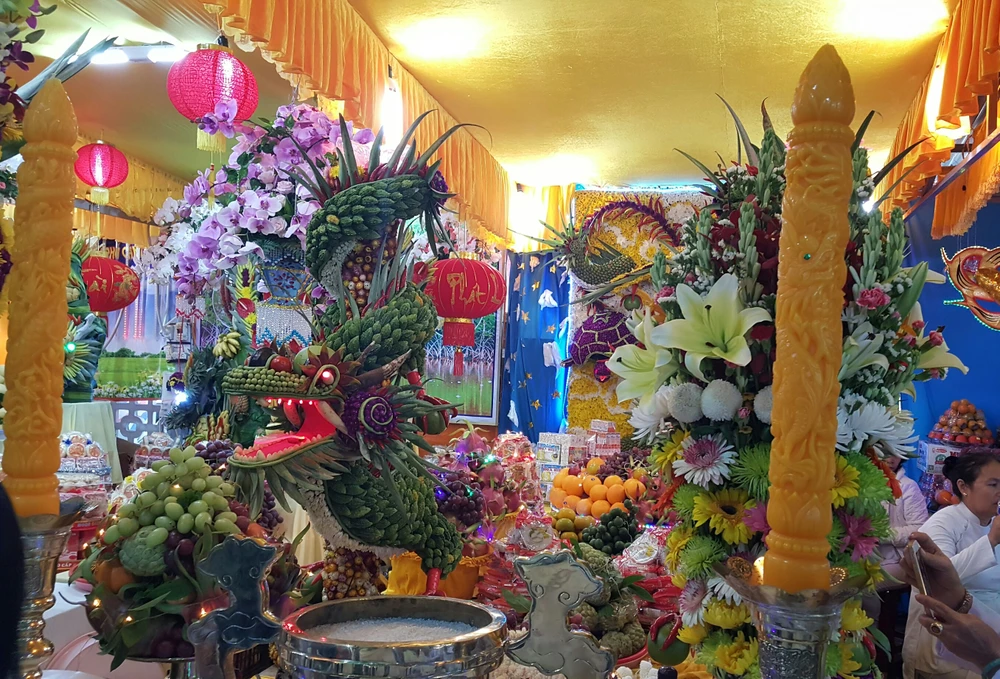 Dâng lễ với hoa trái tạo hình Tứ linh.