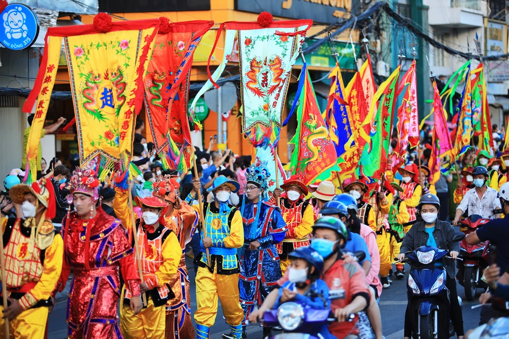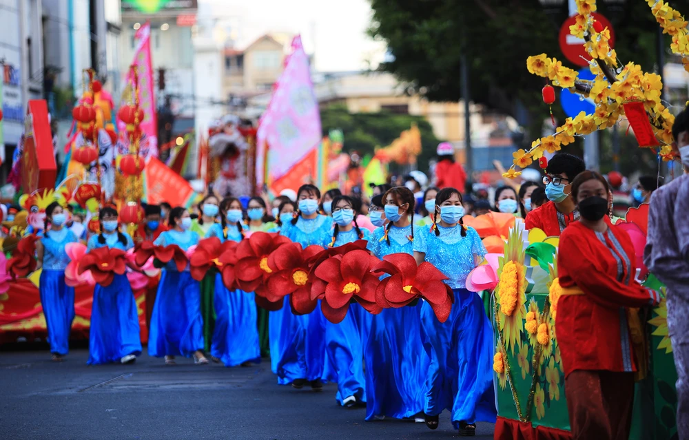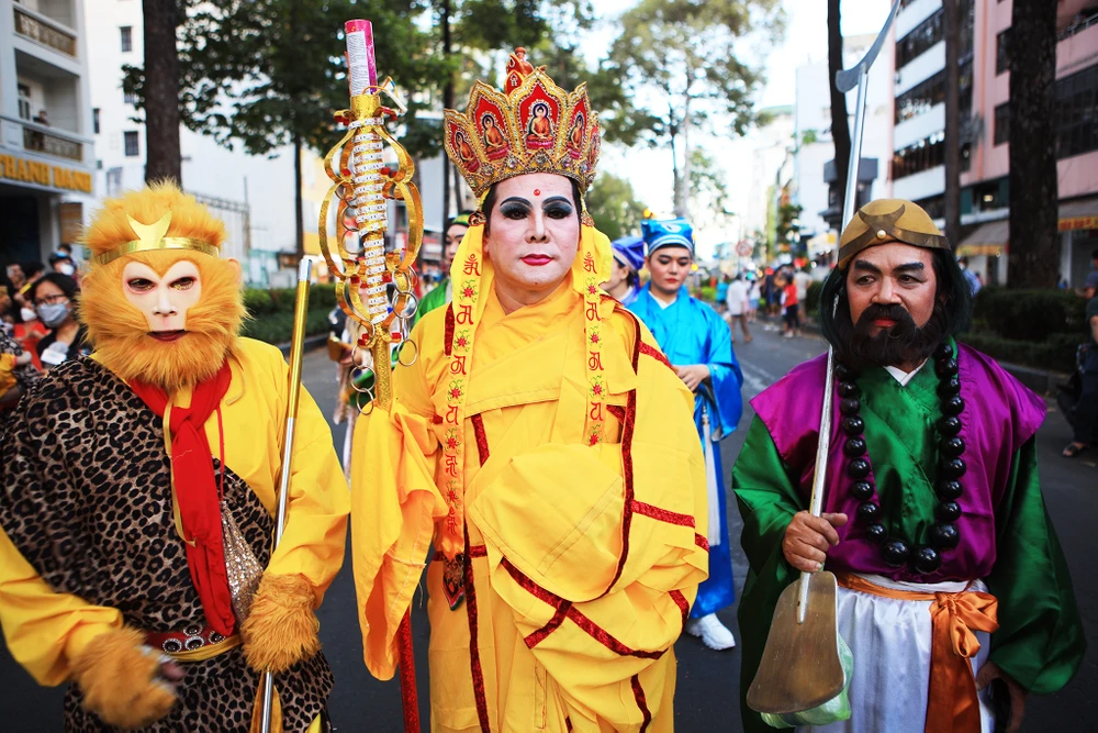 Từ 5h, khoảng 800 người Hoa với trang phục sặc sỡ, hóa trang thành tiên nữ, Thần Tài, thầy trò đường tăng cùng diễu hành quanh các tuyến đường tại quận 5.