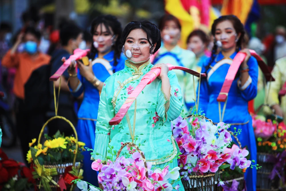 Trong trang phục truyền thống kèm chiếc khẩu trang phòng dịch, Lư Sở Anh (18 tuổi) cùng tham gia gánh hoa cho đoàn diễu hành. "Em tham gia lễ hội này từ năm lên 12 tuổi, sau hai năm không tổ chức lễ hội, hôm nay em cảm nhận được không khí rất vui và nhộn nhịp hơn hẳn." - Sở Anh chia sẻ.