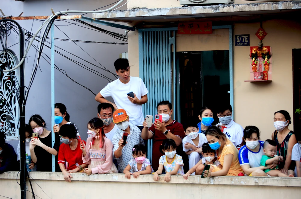 Trên các cư xá người dân dùng điện thoại lưu lại khoảnh khắc của đoàn diễu hành.