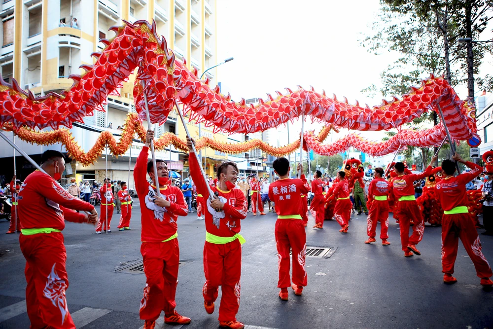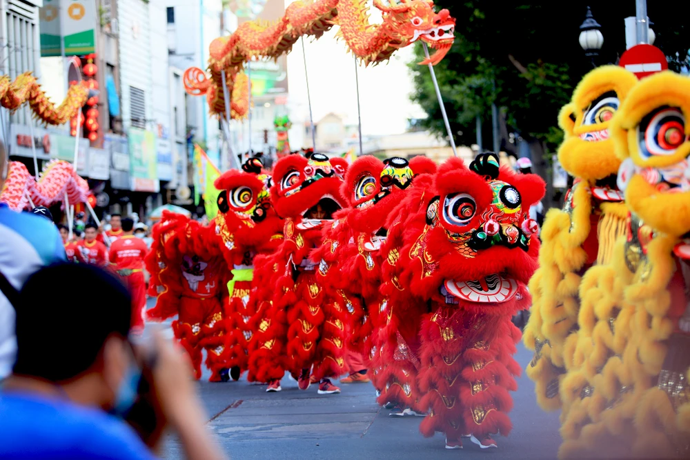 Đoàn lân rực rỡ màu sắc đến từ nhiều hội biểu diễn ở quận 5, TP.HCM.