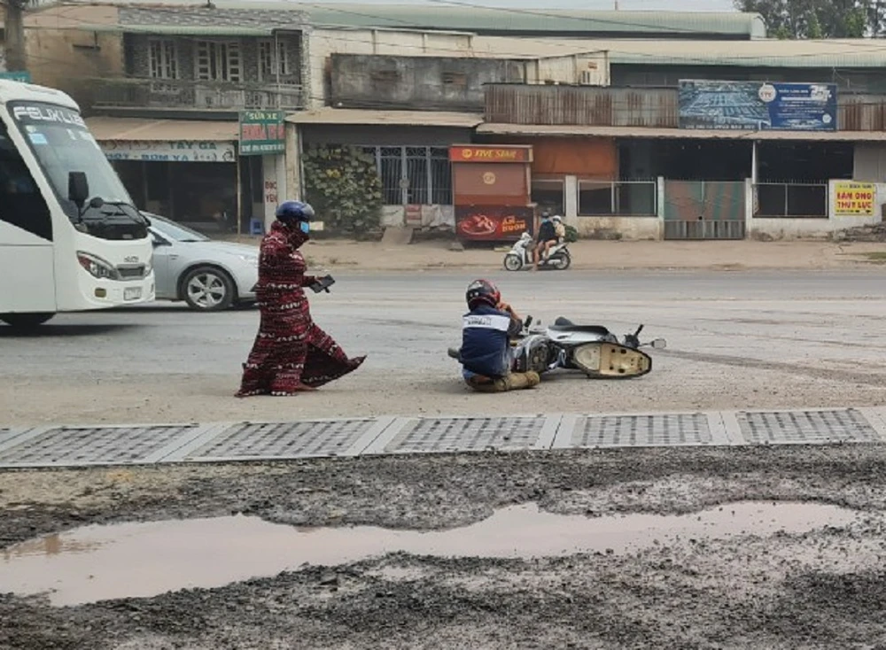 Người đi xe máy gặp tai nạn vì đường trơn trượt. Ảnh: VŨ HỘI.