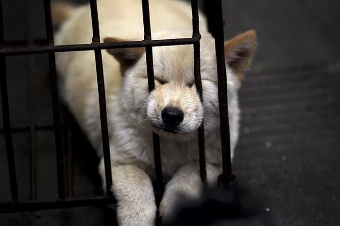 Một chú chó buồn bã nằm trong lồng chờ chết