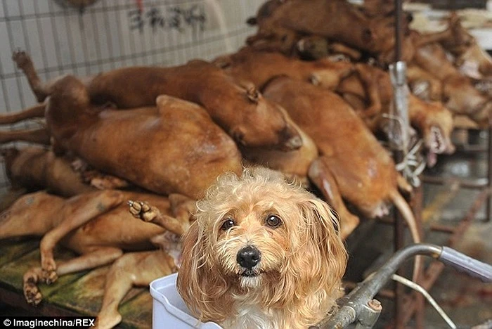 Ánh mắt của một chú chó bên cạnh đồng loại đã bị làm thịt của mình