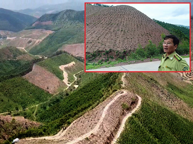 Rừng phòng hộ ở xã An Sinh, thị xã Đông Triều (Quảng Ninh) bị “cạo trọc” lởm chởm. Ảnh nhỏ: ông Phạm Văn Triển, Hạt trưởng Hạt Kiểm lâm Đông Triều, đi kiểm tra rừng bị “cạo trọc”. Ảnh: H.HOÀNG