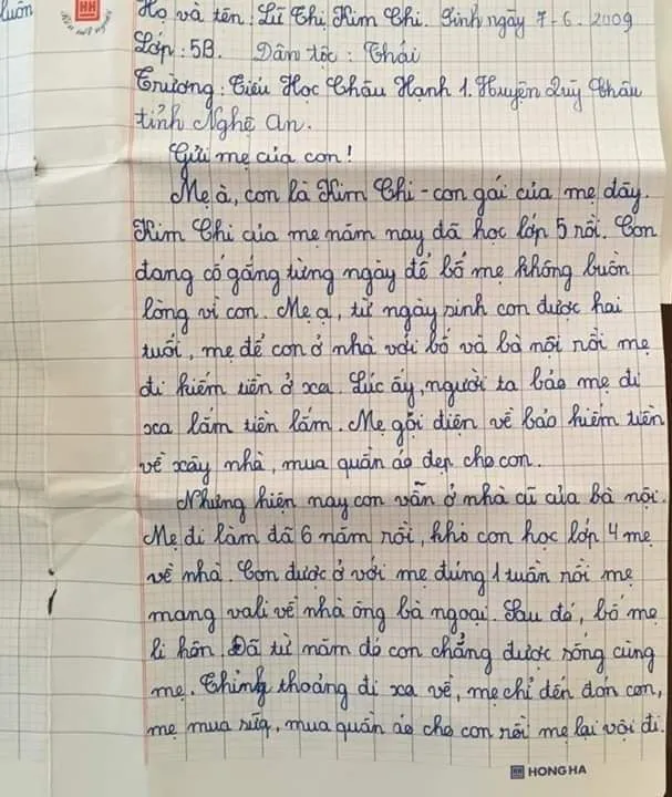 Mẹ à, con là Kim Chi - con gái của mẹ đây. Kim Chi của mẹ đã học lớp 5 rồi. Con đang cố gắng từng ngày để bố mẹ không buồn lòng vì con. Mẹ à, từ ngày sinh con được 2 tuổi, mẹ để con ở nhà với bố và bà nội rồi mẹ đi kiếm tiền ở xa. Lúc ấy, người ta bảo mẹ đi xa lắm. Mẹ gọi điện về bảo kiếm tiền về xây nhà, mua quần áo đẹp cho con.