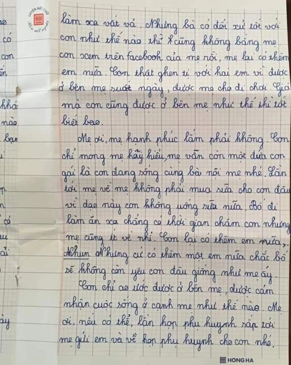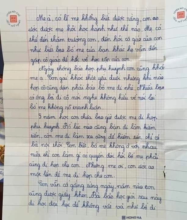 5 năm học con chưa bao giờ được mẹ đi họp phụ huynh. Bố lúc nào cũng bận đi làm kiếm tiền, còn mẹ đi làm xa cũng để kiếm tiền, chỉ có bà nội thôi. Con biết, bố mẹ không ở với nhau nữa thì con làm gì có quyền đòi hỏi bố mẹ phải cùng đi họp cho con. Nhưng mẹ ơi, con ước ao một lần để mẹ họp cho con. Con vẫn cố gắng từng ngày, năm nào con cũng được giấy khen. Bà bảo học giỏi sau này đi học Đại học để không vất vả như bố đi làm xa vất vả. Nhưng bà có đối xử tốt với con như thế nào thì cũng không bằng mẹ. Con xem trên Facebook của mẹ rồi, mẹ lại có thêm em nữa. Con thật ghen tị với hai em vì được ở bên mẹ suốt ngày, được mẹ cho đi chơi. Giá mà con cũng được ở bên mẹ như thế thì tốt biết bao.
