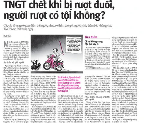 | Sơ thẩm xử giết người, phúc thẩm hủy án Theo hồ sơ, Nguyễn Quý Hợi (huyện Ea H’Leo, Đắk Lắk) không kết hôn nhưng có con chung với con gái của ông Nguyễn Hồng Thanh. Vì vậy, giữa Hợi và ông Thanh có xích mích. Khoảng 16 giờ ngày 22-5-2011, ông Thanh đang chạy xe máy trên đường tại xã Ea Nam thì gặp Hợi. Ông Thanh chửi Hợi. Hợi chạy máy cày đến để ở chỗ vợ đang bán dưa hấu gần đó rồi lấy khúc gỗ dài khoảng 80 cm chạy xe máy đuổi theo ông Thanh để đánh. Hợi chạy xe với vận tốc 80 km/giờ. Ông Thanh phát hiện Hợi đuổi theo phía sau nên hoảng sợ và chạy xe với tốc độ nhanh, vừa chạy vừa hô “Cứu, cứu…”. Đến đoạn đường cong, ông Thanh chạy xe về phía bên trái đường theo hướng đang đi nên đã đâm vào xe máy ngược chiều. Hậu quả ông Thanh tử vong ngay tại chỗ. Ban đầu, Hợi bị CQĐT Công an huyện Ea H’Leo khởi tố về tội gây rối trật tự công cộng. Sau đó, vụ án được chuyển lên cơ quan tố tụng cấp tỉnh và Hợi bị khởi tố, truy tố về tội giết người. Tháng 5-2014, TAND tỉnh Đắk Lắk xử sơ thẩm, tuyên phạt Hợi 12 năm tù về tội giết người với tình tiết định khung phạm tội có tính chất côn đồ. Tháng 9-2014, Tòa Phúc thẩm TAND Tối cao tại Đà Nẵng (nay là TAND Cấp cao tại Đà Nẵng) nhận định TAND tỉnh Đắk Lắk xử Hợi tội giết người là không đúng pháp luật. Xét về hành vi, hậu quả và mối quan hệ nhân quả thì thấy Hợi không trực tiếp gây ra cái chết đối với ông Thanh nên không phạm tội giết người mà có thể bị điều tra về một tội khác (nếu có). Từ đó tòa hủy án sơ thẩm, giao hồ sơ cho cấp sơ thẩm điều tra lại. Bản án phúc thẩm này sau đó bị chánh án TAND Tối cao kháng nghị và Hội đồng Thẩm phán TAND Tối cao xử giám đốc thẩm hủy án, yêu cầu xử phúc thẩm lại. CSGT nên chấm dứt đuổi xe vi phạm Gần đây trên các trang mạng, dư luận cũng rất quan tâm đến việc CSGT rượt đuổi “xe điên” trên phố, có trường hợp rượt đến 20 km mới bắt được. Việc làm này rõ ràng là nguy hiểm đến tính mạng, sức khỏe của nhiều người và gây mất trật tự công cộng. Thiết nghĩ công an các địa phương nên chấn chỉnh. Nếu người vi phạm không tuân thủ hiệu lệnh của CSGT thì chỉ cần ghi lại biển số xe, sau đó truy tìm ra thủ phạm không có gì là khó khăn cả. |