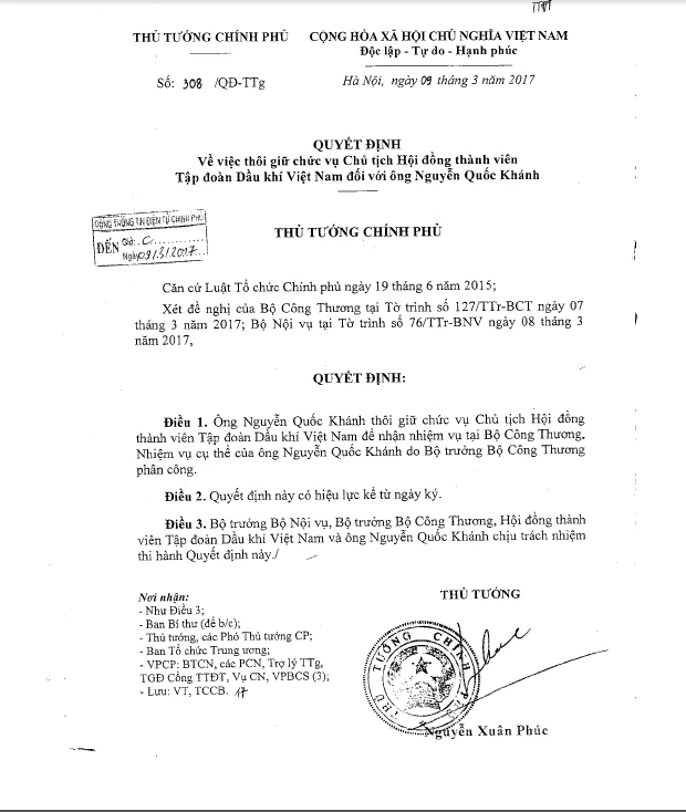 Theo quyết định của Thủ tướng, Chủ tịch PVN Nguyễn Quốc Khánh sẽ thôi giữ chức chủ tịch PVN và được điều động về Bộ Công Thương. Hiện tại Tổng giám đốc PVN Nguyễn Vũ Trường Sơn sẽ tạm kiêm nhiệm công việc ông Khánh để lại trong lúc chờ nhân sự mới cho vị trí Chủ tịch tập PVN. Quyết định này có hiệu lực từu ngày 9-3-2017.