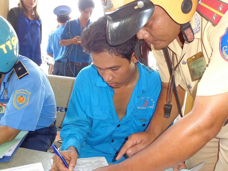 Một tài xế ký biên bản xử phạt vì chở hàng quá tải. Ảnh: L.ĐỨC - H.TUYÊN