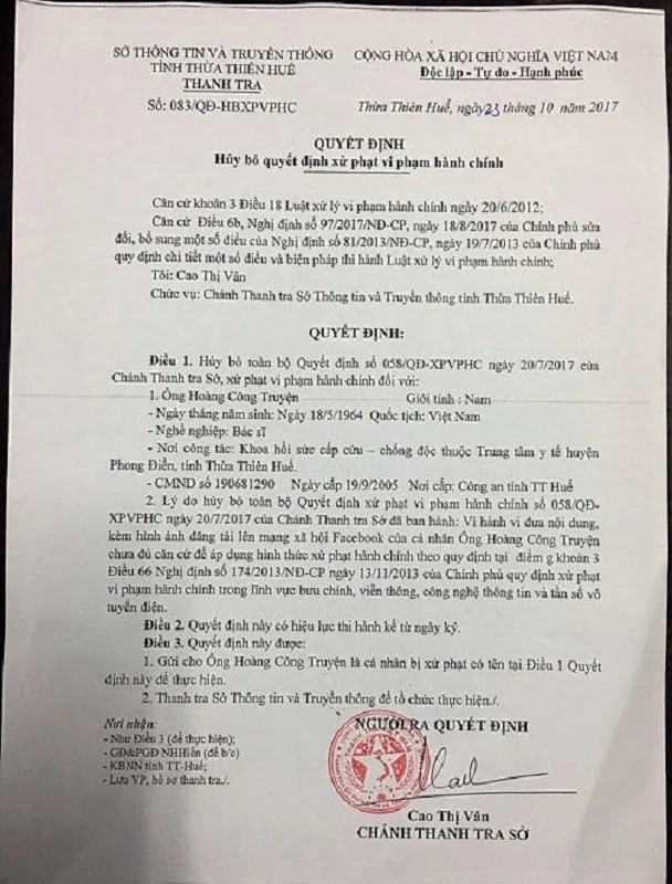 Chiều 23-10, ông Lê Sỹ Minh, Giám đốc sở TT&TT Thừa Thiên - Huế có buổi làm việc với báo chí thông tin về việc hủy quyết định xử phạt hành chính đối với BS Hoàng Công Truyện (Phó Trưởng khoa Hồi sức cấp cứu thuộc Trung tâm Y tế huyện Phong Điền).