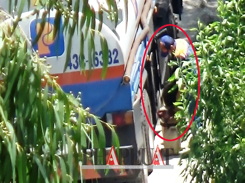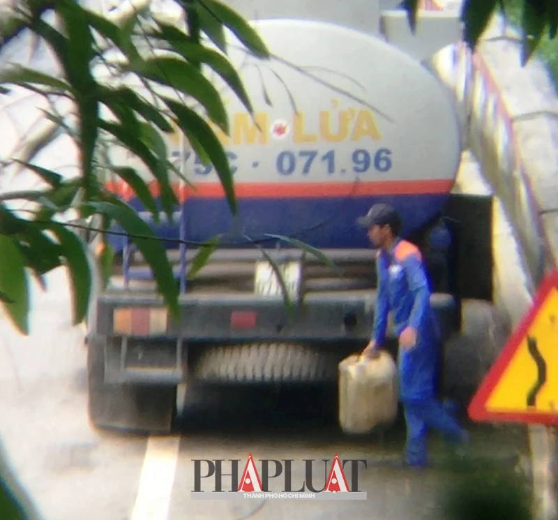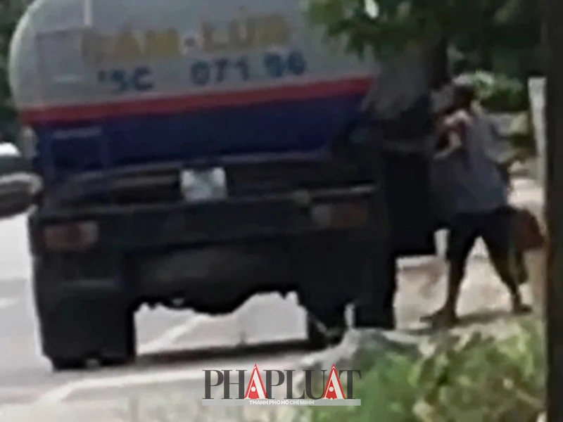 Tại đây, tài xế đi vào trong khoảng vài phút thì xuất hiện một thanh niên mặc áo trắng, đội nón lưỡi trai đi về phía thùng phụ đựng phụ tùng của xe bồn. Thanh niên này sau vài giây đảo mắt rồi rất nhanh rút can nhiên liệu, xách chạy thẳng vào nhà.