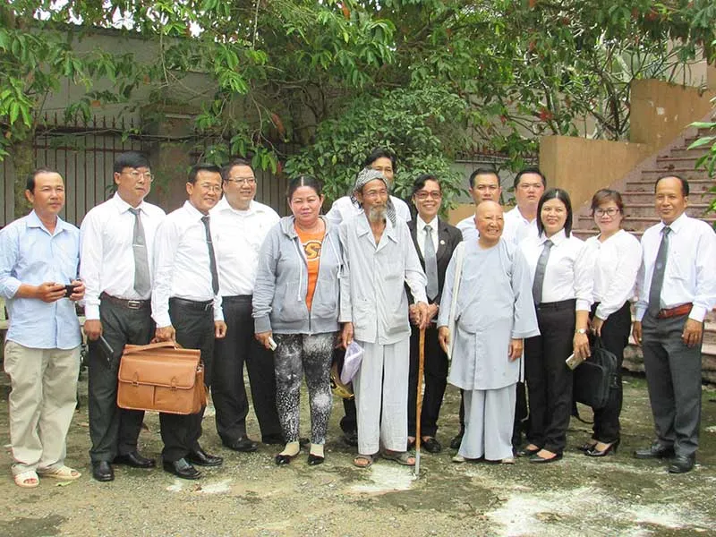 Ông Đinh Công Mách (giữa) và người nhà chụp ảnh với các luật sư sau phiên tòa phúc thẩm. Ảnh: NN
