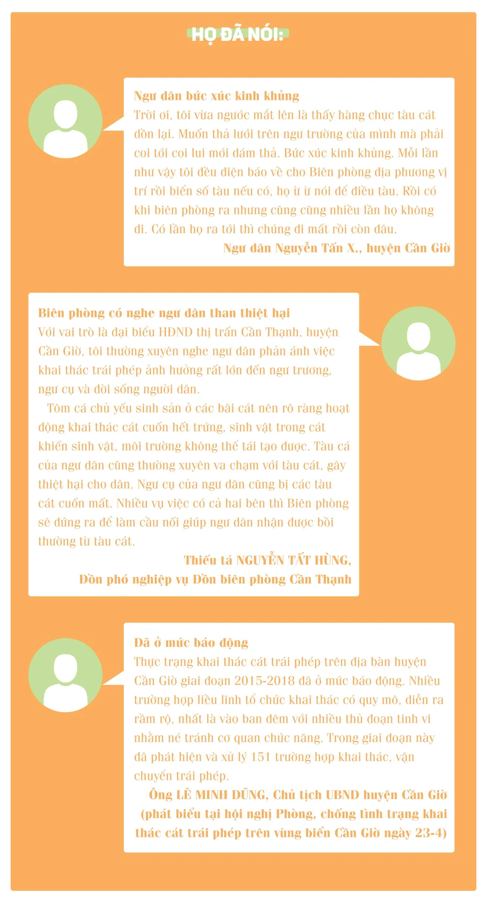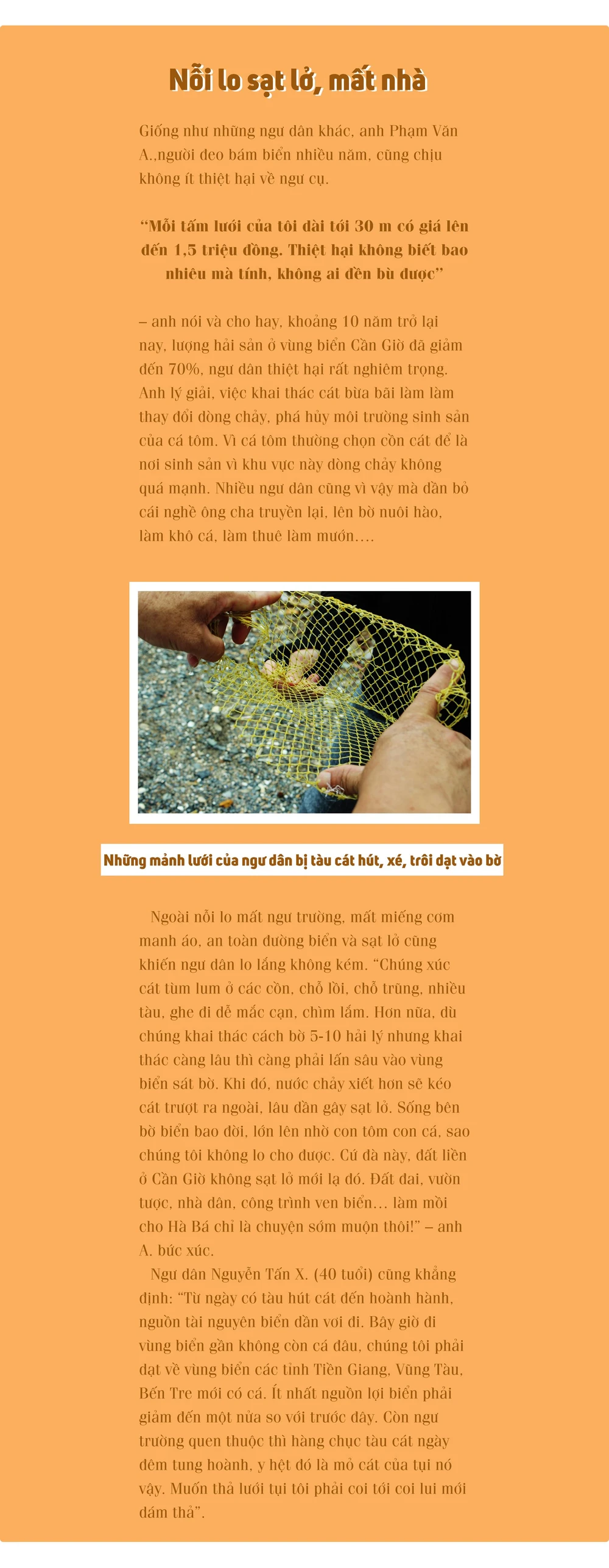 Theo anh T., rất nhiều tàu cát hoạt động trên biển Cần Giờ đi từ vùng biển Vũng Tàu ra, tốp này về tốp khác ra. Có hôm 2-3 giờ sáng anh giong tàu ra biển đánh mẻ cá sớm thì thấy ngư trường quen thuộc giờ đã thành sa trường. Lúc đó, anh chỉ biết tìm chỗ nào vắng vẻ nhất để thả lưới, mong kiếm được ít cá.