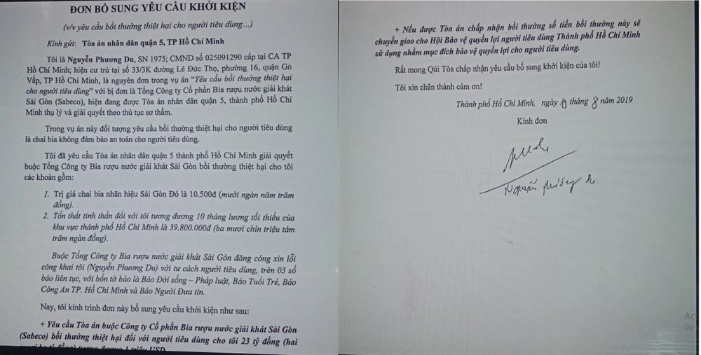 Tuy nhiên, sau đó phía Sabeco không thực hiện lời hứa này khiến ông Du vô cùng bức xúc. “Việc tôi là người tiêu dùng, mua phải sản phẩm không bảo đảm chất lượng hàng hóa như mô tả ở trên đã gây thiệt hại cho tôi” - ông Du trình bày trong đơn.