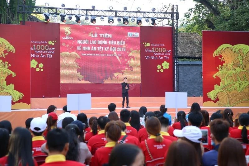 Sáng nay 1-2, tại Nhà văn hoá Thanh niên TP.HCM, Trung ương Đoàn Thanh niên cộng sản Hồ Chí Minh phối hợp cùng Tổng công ty Cổ phần Bia Rượu Nước giải khát Sài Gòn (Sabeco) tổ chức lễ Tiễn người lao động có thành tích làm việc tiêu biểu nhận 1.000 vé máy bay từ chương trình Về nhà ăn Tết 2019.