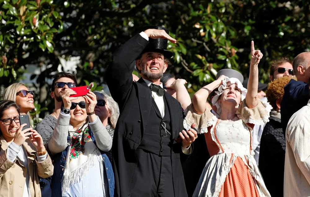 Dù truyền thống của Halloween là hóa trang thành các nhân vật ma quỷ, người dân mọi nơi hiện nay "đóng vai" bất cứ ai họ thích. Trong ảnh là một người dự lễ hội Halloween gần Nhà Trắng hóa trang thành cựu Tổng thống Mỹ Abraham Lincoln và phu nhân Mary Todd Lincoln. Ảnh: Reuters