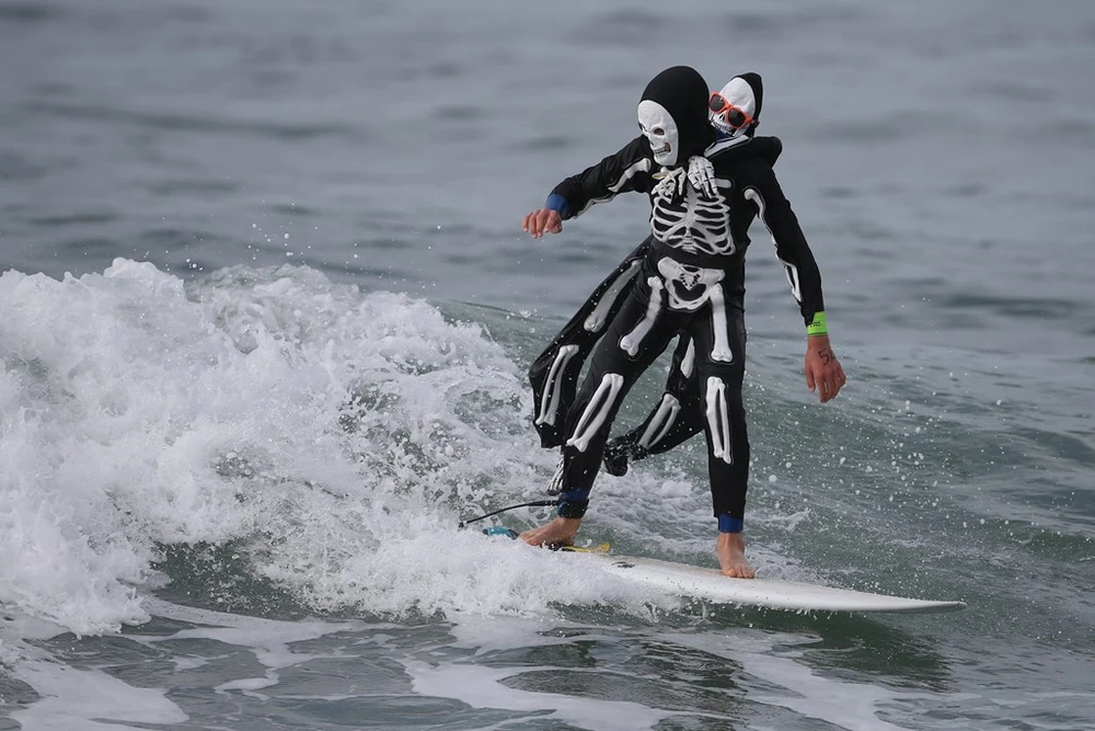 Một thí sinh trong cuộc thi lướt ván Halloween tổ chức tại Santa Monica (California, Mỹ). Ảnh: Reuters