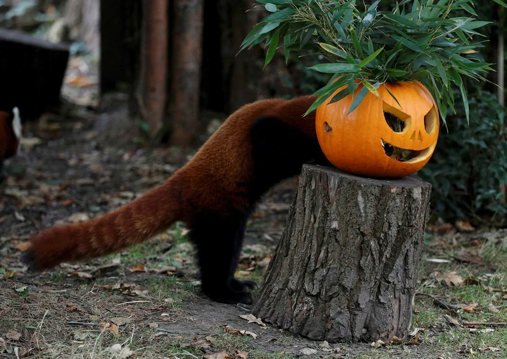 Vào dịp Halloween, các gia đình khắc mặt người lên một quả bí ngô rồi thắp nến bên trong. Đèn lồng bí ngô được treo trước thềm nhà, xua đuổi, không cho các linh hồn vất vưởng vào quấy nhiễu nhà người sống. Trong ảnh là một chú gấu trúc đỏ rúc đầu vào quả bí ngô trong sở thú Chester (Anh). Ảnh: Reuters