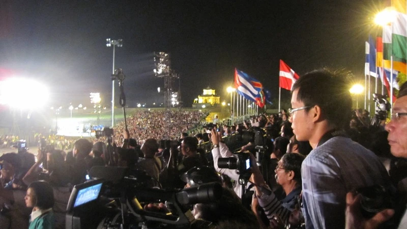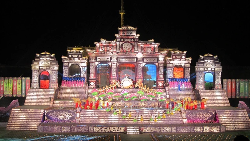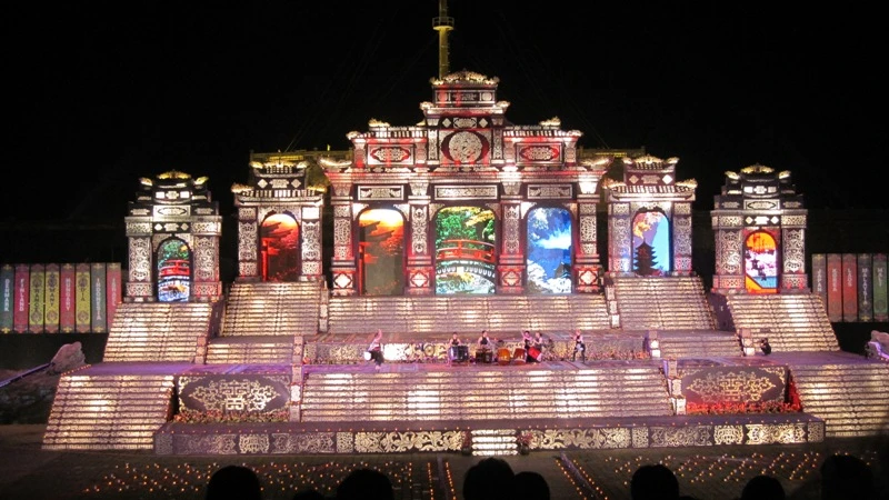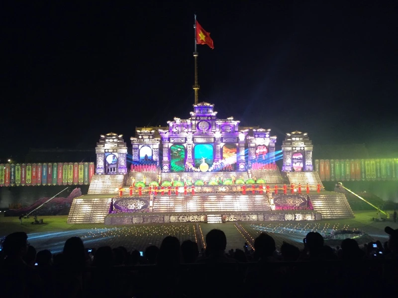 Từ 18 giờ, dọc con đường hai bên sông Hương sáng rực với những ánh đèn lấp lánh đủ màu sắc của cầu Trường Tiền, khu đại nội khiến cả thành phố Huế như đang cồn cào trước giờ khai hội. 19 giờ, từng dòng người ken kín mọi ngã đường dẫn vào Ngọ Môn lẫn những con phố xung quanh. Ba khán đài dành cho khách mời và khán giả đã kín chỗ, hàng trăm người không mua được vé vẫn đứng ngồi theo dõi qua màn hình lớn phía ngoài.