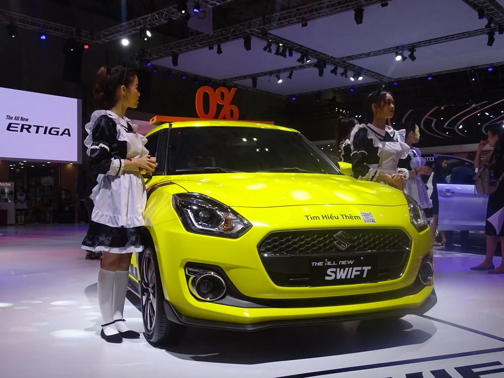 Xuất hiện tại VMS năm nay, “Top ba xe đô thị của năm 2018” được trang trí theo phong cách của mẫu Swift Sport tại thị trường Nhật Bản và châu Âu. Mẫu Swift hiện đại mang màu vàng cá tính, kết hợp với những họa tiết chạy dọc thân xe, giúp xe có dáng vẻ thể thao, nổi bật hơn.