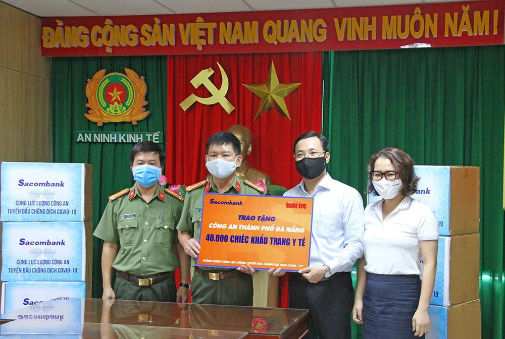 Đại diện Sacombank, ông Nguyễn Hồng Thành – Giám đốc Khu vực Bắc Trung Bộ trao tặng trang phục bảo hộ cho Công an TP. Đà Nẵng