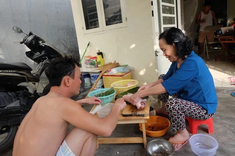 Bà Võ Thị Lan đang cùng con trai chuẩn bị gói bánh chưng tết
