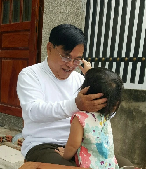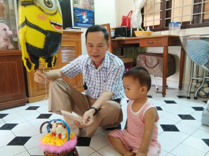 Ông Lê Khắc Trâm trông cháu giúp các con trong những ngày giáp tết