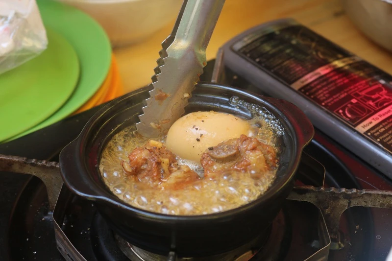 Thịt kho trứng được hâm nóng trên bếp lửa.