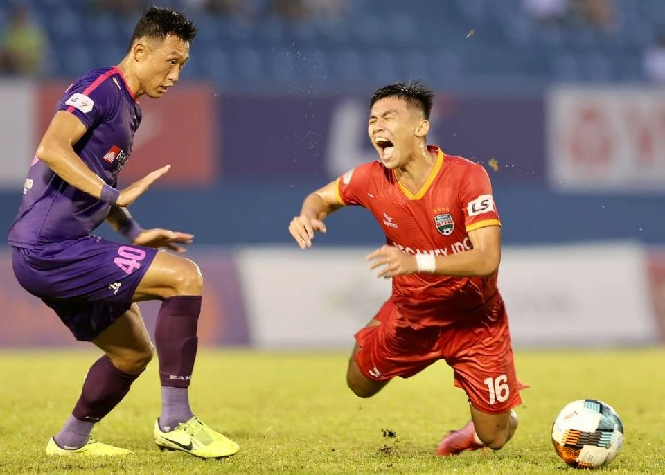 Đội trưởng Quốc Long bất lực trước sức công phá không quá mạnh và thường xuyên nhưng hiểm hóc của cầu thủ B. Bình Dương. Ảnh: ANH PHƯƠNG.
