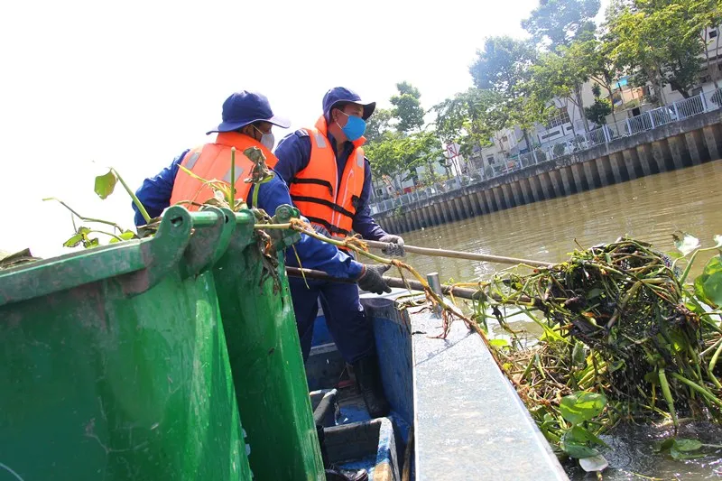 Công nhân Công ty Môi trường đô thị TP vớt rác làm sạch dòng kênh Nhiêu Lộc - Thị Nghè. Ảnh: HTG
