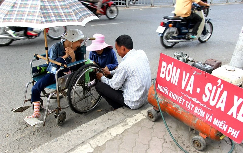 Bơm vá xe miễn phí cho người khuyết tật trên đường Nguyễn Thị Minh Khai, quận 1. Ảnh: HTG