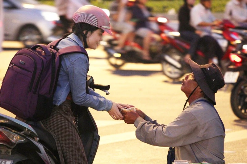 Đó là chú bơm vá xe ở góc đường BV Từ Dũ. Một ngày thậm chí không sửa được chiếc xe nào cho khách mà chỉ toàn bơm vá xe cho người nghèo, người khuyết tật. Họ cùng giúp nhau khắc phục khó khăn để công việc mưu sinh được thuận lợi. Một lời cám ơn chân thành kèm nụ cười tươi rói như một liều thuốc tinh thần giữa Sài Gòn lạ mà quen.