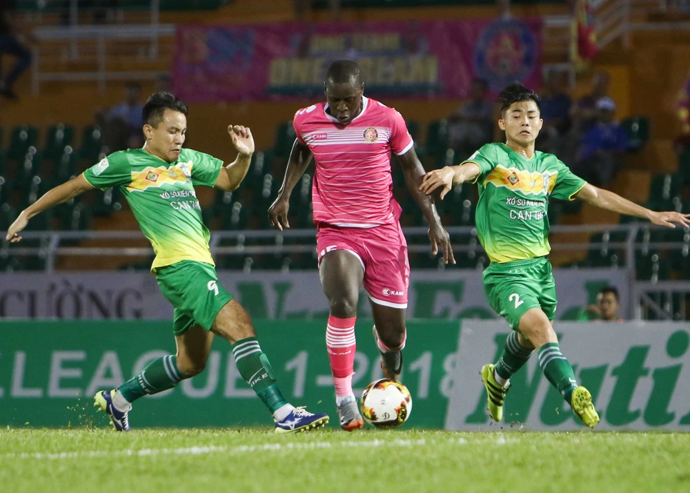 Da Sylva (giữa, Sài Gòn FC) đi bóng trong thế "bánh mì kẹp thịt".