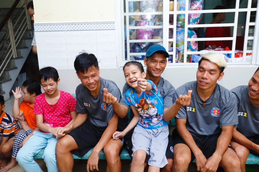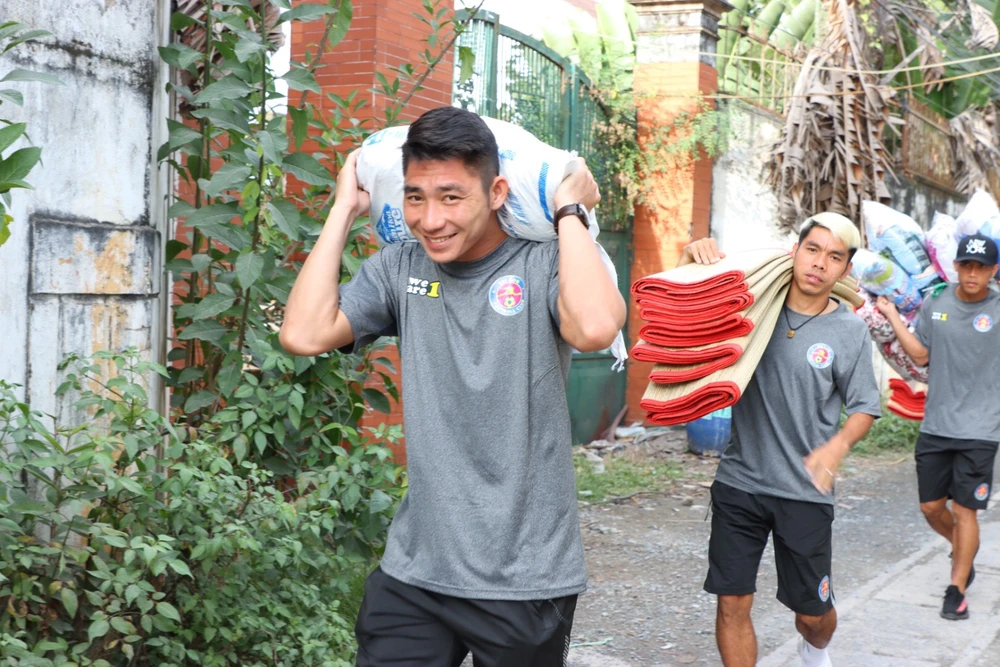 Cầu thủ Sài Gòn FC chia nhau cõng quà đến với Mái ấm Từ Tâm...