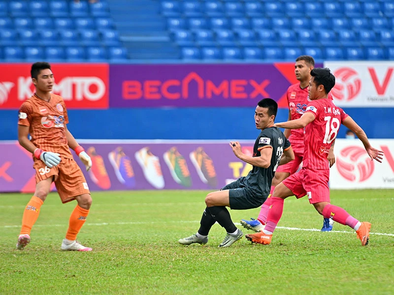 Tô Văn Vũ ghi bàn giữa các hậu vệ và thủ môn Sài Gòn FC.