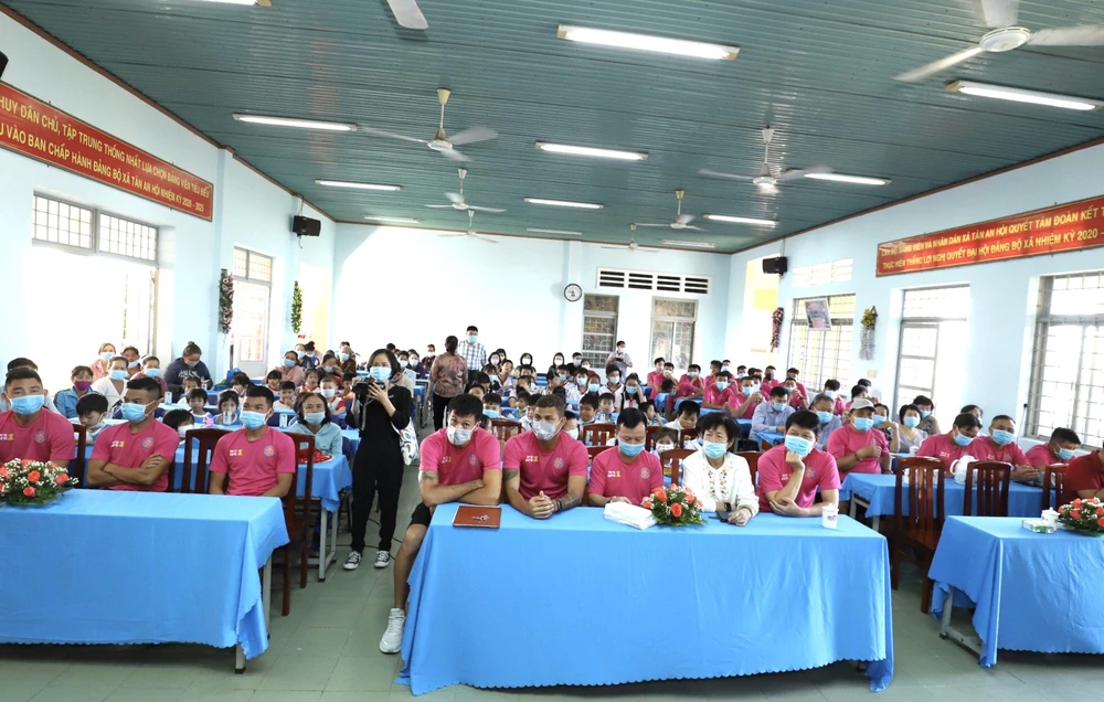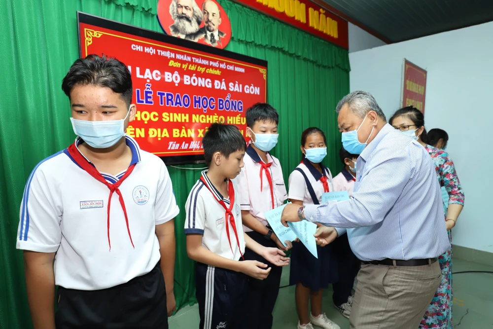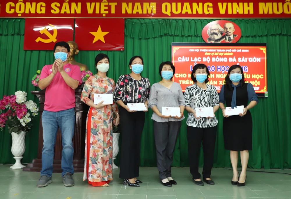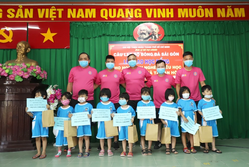 Bà Lê Thị Vân, Chủ tịch Chi hội Thiện nhân TP.HCM và ông Vũ Tiến Thành, Chủ tịch kiêm HLV Sài Gòn FC cùng ban huấn luyện và các cầu thủ đã trao tặng 50 học bổng trị giá 100 triệu đồng và 50 phần quà gồm sữa, áo thun.