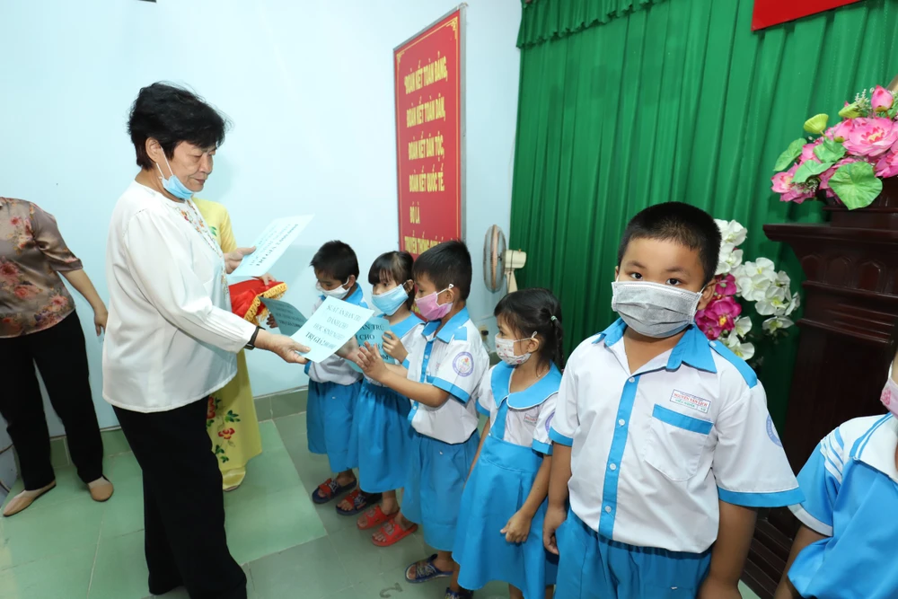 Chủ tịch Chi hội Thiện nhân TP.HCM Lê Thị Vân trao gửi yêu thương từ CLB Sài Gòn cho những mầm non nghèo hiếu học.