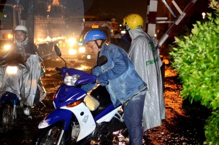 Cơn mưa kéo dài hơn 2 tiếng đồng hồ gần như đã nhấn chìm đường Kinh Dương Vương. Rất nhiều xe bị chết máy, người dân phải dẫn bộ thành hàng dài. Trong khi một số phương tiện khác may mắn hơn vẫn cố rồ ga vượt qua dòng nước.