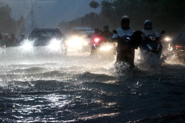 Đến hơn 19 giờ, nhiều người còn bị mắc kẹt trên đường, tình trạng ngập nặng vẫn còn tiếp diễn. Ảnh: Lê Khánh