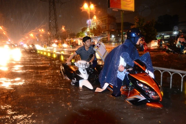 Mưa lớn chiều tối 15-9 khiến nhiều tuyến đường TP.HCM ngập như sông. Ảnh: Lê Khánh