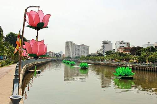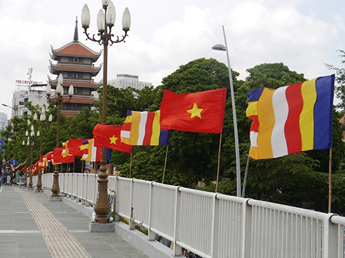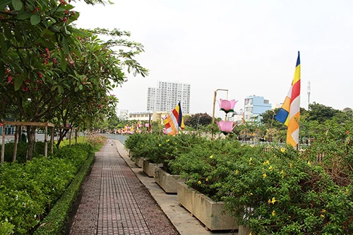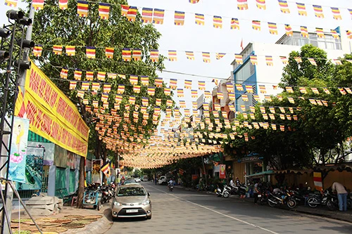 Cờ, hoa đăng được treo lộng lẫy trên nhiều tuyến đường càng làm cho ngày lễ Phật đản sắp đến thêm tươi vui và góp phần làm đẹp TP.