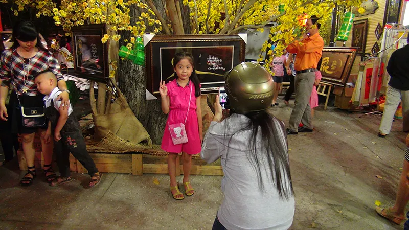 Một em bé "xé rào" tạo dáng chụp ảnh trên đường hoa Hàm Nghi.