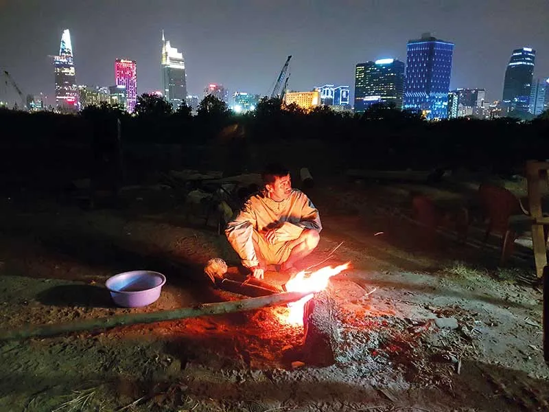 Hơn 0 giờ sáng, tôi di chuyển về hướng chợ Bến Thành. Cảnh náo nhiệt của phố Bùi Viện làm tôi “nóng trong người” bao nhiêu thì chỉ đi khoảng 1 km, cái lạnh của trời khuya đã khiến tôi rùng mình. Ngay giữa quận 1, trung tâm của Sài Gòn, cùng trong một đêm là hai hình ảnh trái ngược. Đập vào mắt tôi lúc này là 3-4 chiếc xích lô cũ kỹ nép vào sát mái hiên bên góc đường. Vài người đang gom ít gỗ, giấy để đốt một đống lửa.