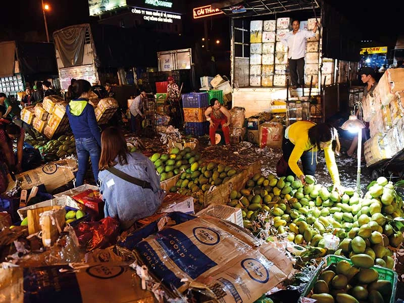 Đêm hôm sau, tôi tiếp tục ra đường vào lúc 0 giờ. Điểm dừng chân lần này là chợ đầu mối Thủ Đức - chợ nông sản lớn nhất Sài Gòn. Hai giờ sáng là lúc chợ rộn ràng nhất. Những chuyến xe chở hàng hối hả ra vào. Người mua kẻ bán lao xao, miệng trả giá còn tay thoăn thoắt chọn cho mình những mặt hàng tươi ngon nhất để về cho kịp phiên chợ sớm.Từng túi rau, củ được buộc sẵn chất đầy bên đường chờ tiểu thương quen đến lấy.