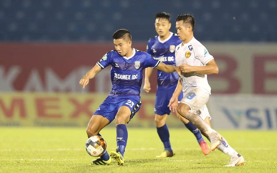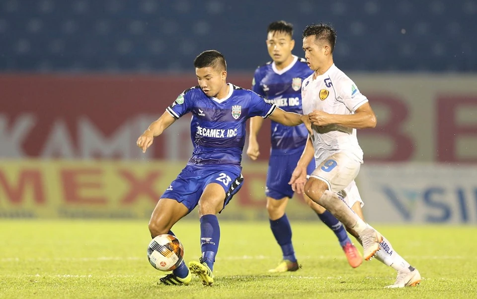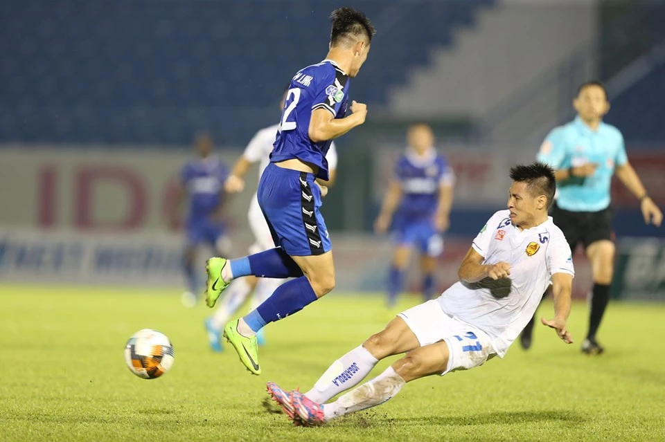 ... cùng những pha bóng mạnh mẽ nhằm ngăn cản chân sút trẻ Tiến Linh của chủ nhà B. Bình Dương.