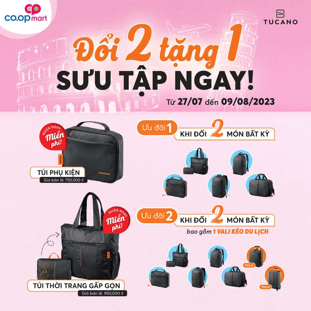 Trong thời gian từ 27-7 đến 9-8, khách hàng sẽ được tặng thêm chương trình ưu đãi “Đổi 2 tặng 1”: đổi hai sản phẩm bất kỳ sẽ được tặng thêm một sản phẩm. Ngoài ra, khách hàng thành viên khi đổi thành công trọn bộ bảy sản phẩm túi và hành lý Tucano sẽ được tặng ngay một phiếu mua hàng trị giá 200.000 đồng.