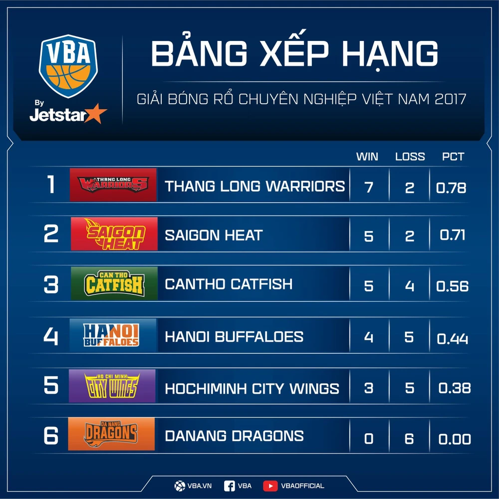 Giải bóng rổ chuyên nghiệp Việt Nam - VBA đang đi vào giai đoạn quyết liệt. Mặc dù được chơi trên sân nhà CIS nhưng sau trận thua 62-78 trước Cantho Catfish, Saigon Heat đánh mất ngôi đầu về tay Thăng Long Warriors - đội bóng vừa có chiến thắng thứ bảy, đánh bại "người láng giềng" Hanoi Buffaloes tỉ số 71-61.