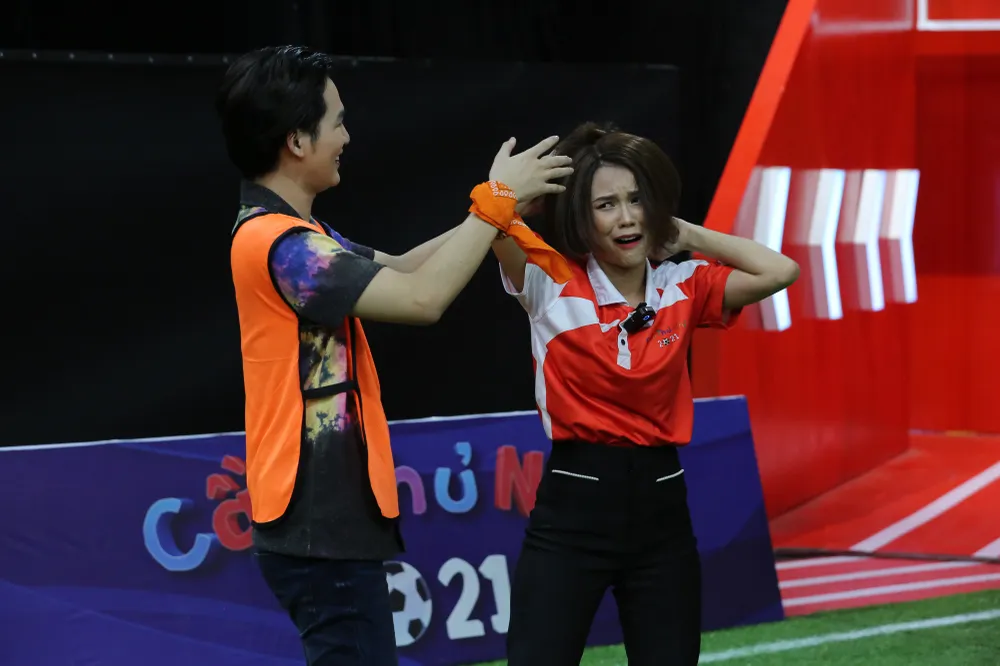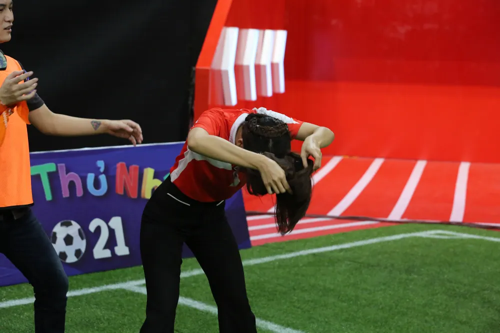 Lúc này, vẻ mặt ngại ngùng của nữ MC cùng với những tiếng cười sặc sụa của mọi người đã chứng minh được tài năng bóng đá thật sự của nữ MC.