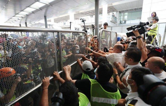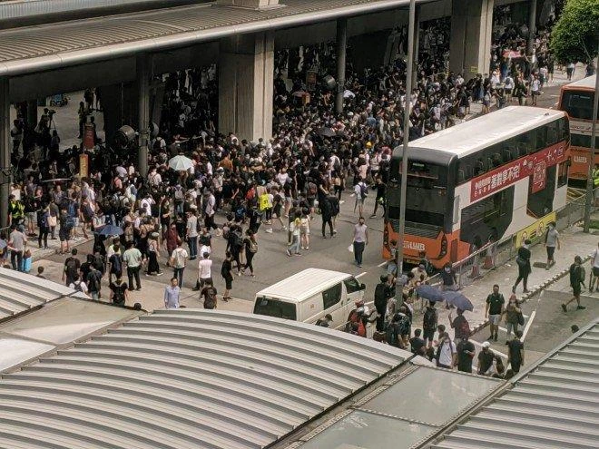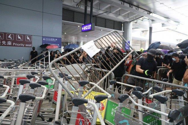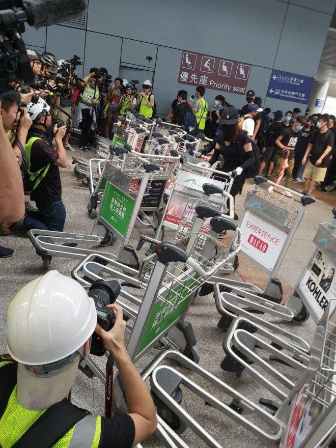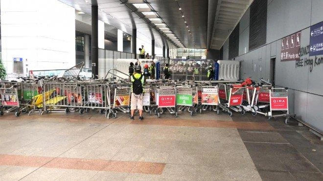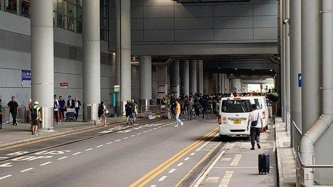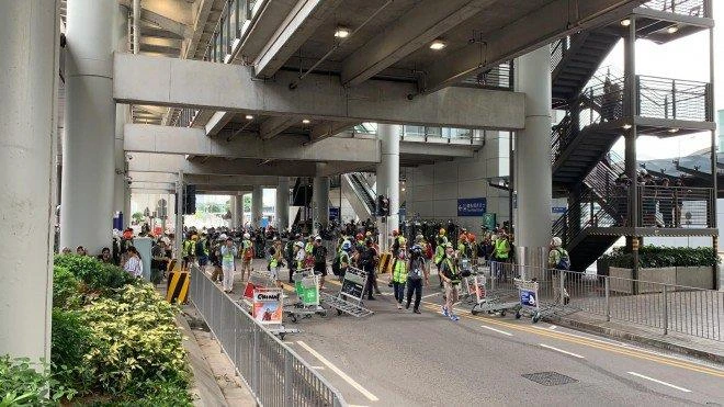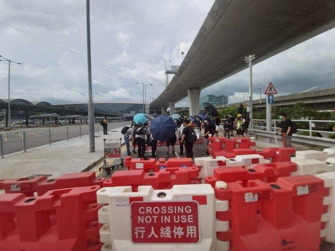 Hiện tuyến đường chính dẫn đến sân bay bị kẹt nghiêm trọng. Tại khu vực bên ngoài sân bay, người biểu tình đã bắt đầu xúc tiến dựng hàng rào. Nhiều máy quay an ninh ở sân bay bị người biểu tình sơn đen, dán che.